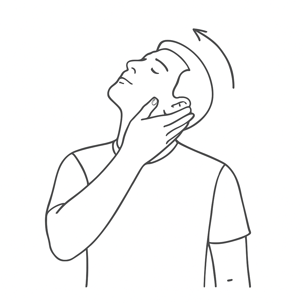 - Ejecución: Gira suavemente la cabeza para mirar hacia arriba y a la derecha (o hacia abajo y a la izquierda). Coloca la mano derecha sobre la mejilla izquierda y la mandíbula, aplicando una leve presión para intensificar el estiramiento. Mantén el estiramiento durante 30 segundos.