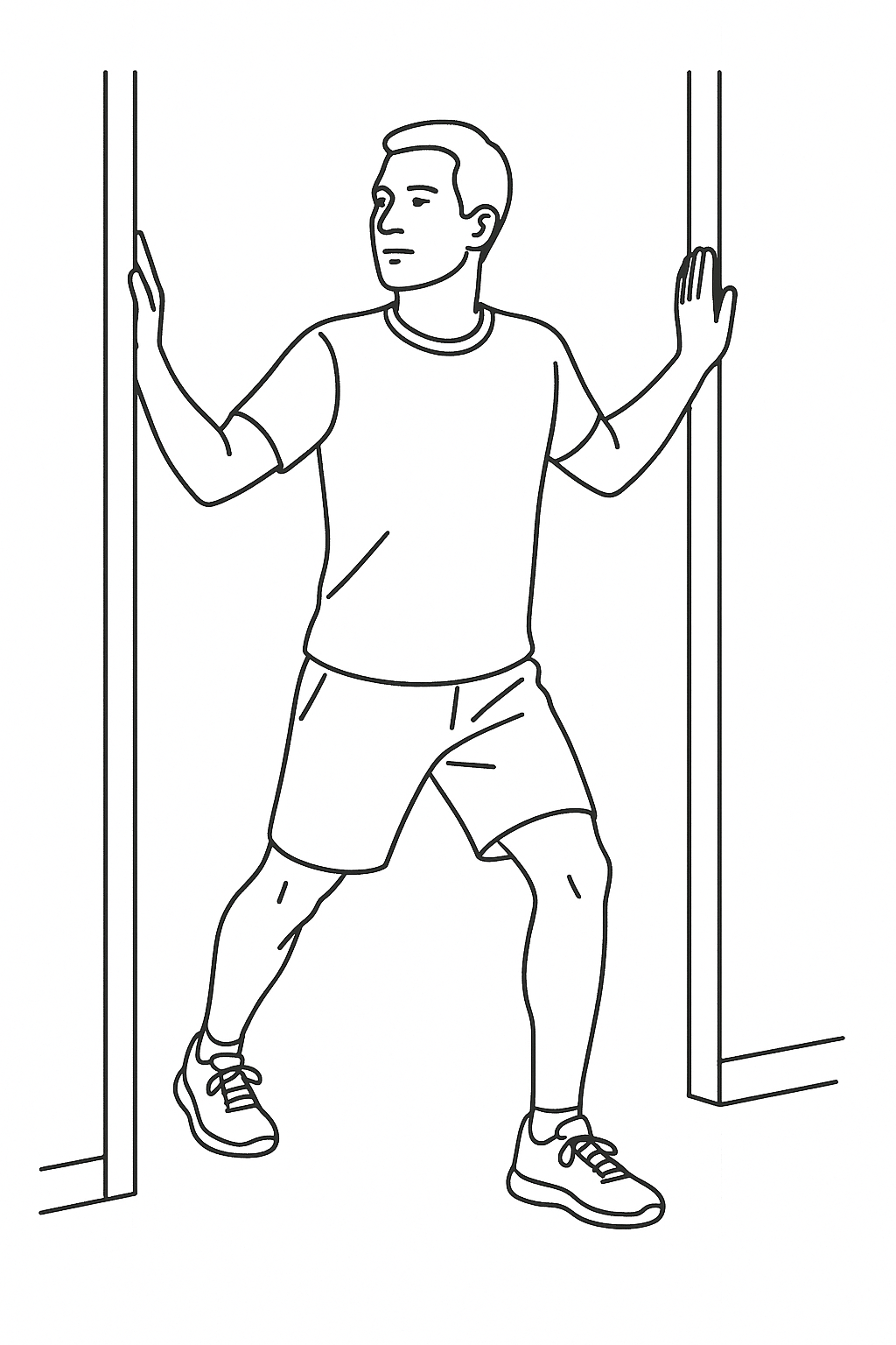 - Posición: Ponte en el marco de una puerta. Coloca las manos y los antebrazos a la altura de los hombros en los costados de la puerta.