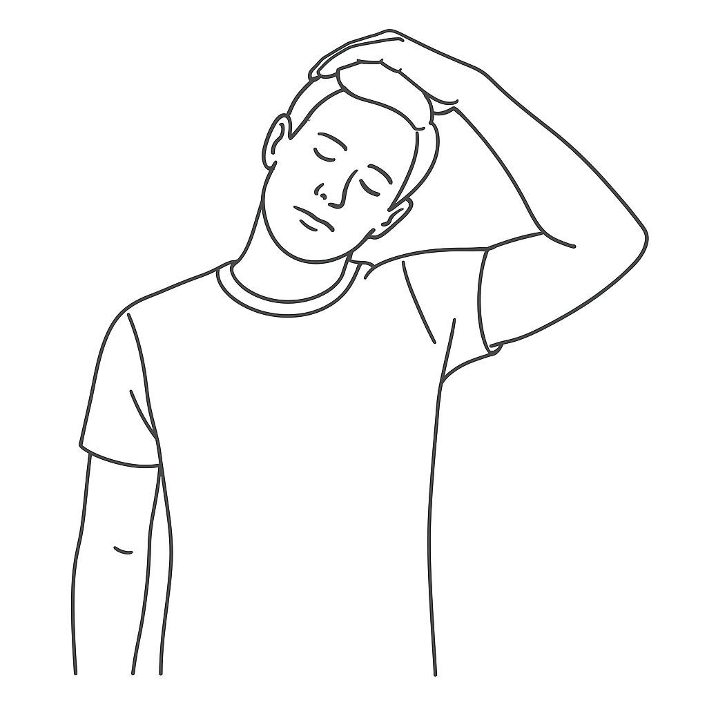 - Ejecución: Siéntate o colócate de pie con el brazo derecho apuntando hacia abajo. Coloca la mano izquierda sobre la cabeza. Inclina suavemente la cabeza hacia el hombro izquierdo para estirar los músculos del lado derecho del cuello. Mantén el estiramiento durante 30 segundos.