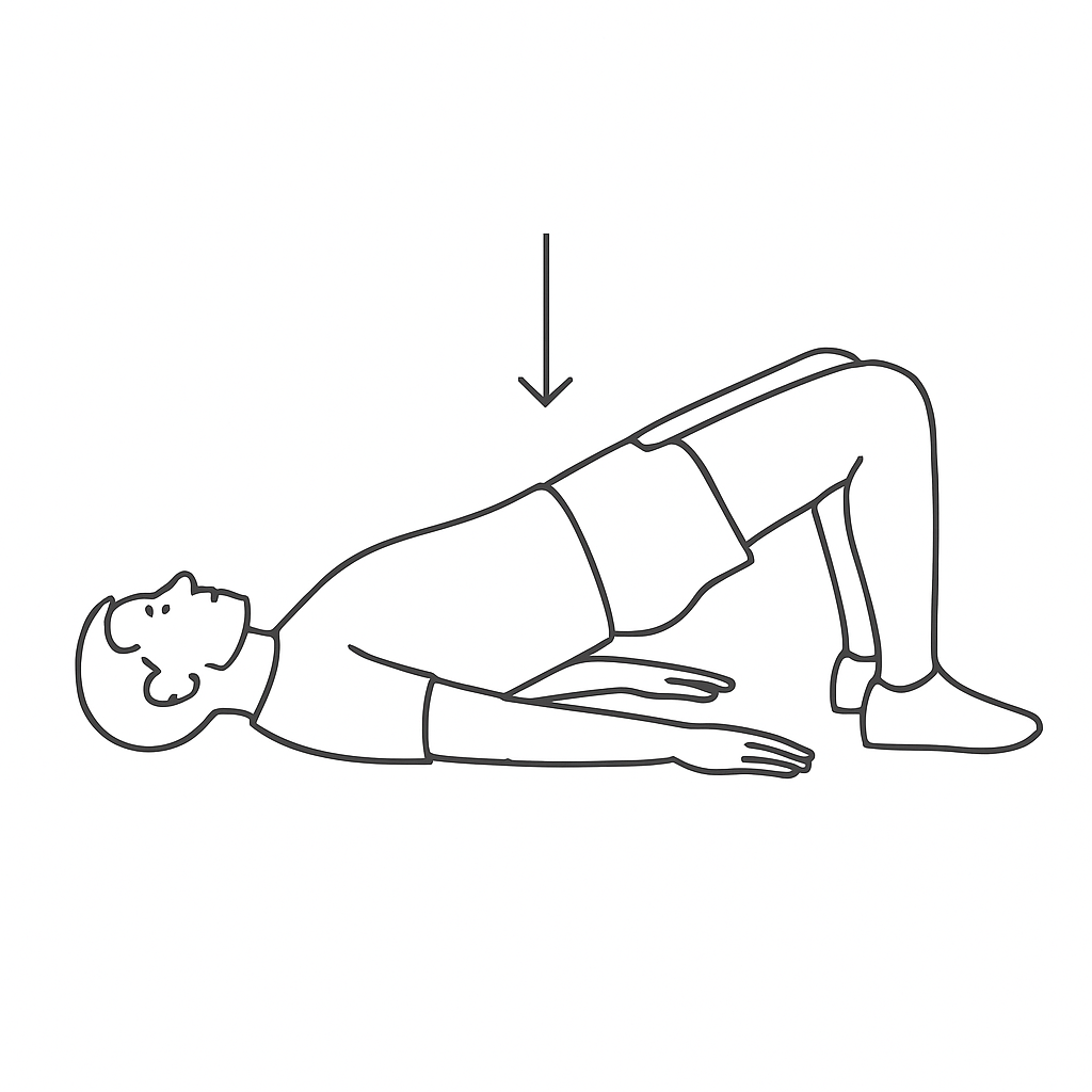 - Tumbado bocarriba, rodillas flexionadas, eleva pelvis alineando tronco y muslos, aprieta glúteos suavemente y baja controlado.