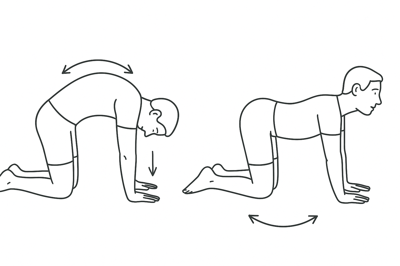 - En cuadrupedia, alterna arquear espalda hacia arriba y hundir abdomen hacia el suelo, manteniendo cada posición 5 s.
