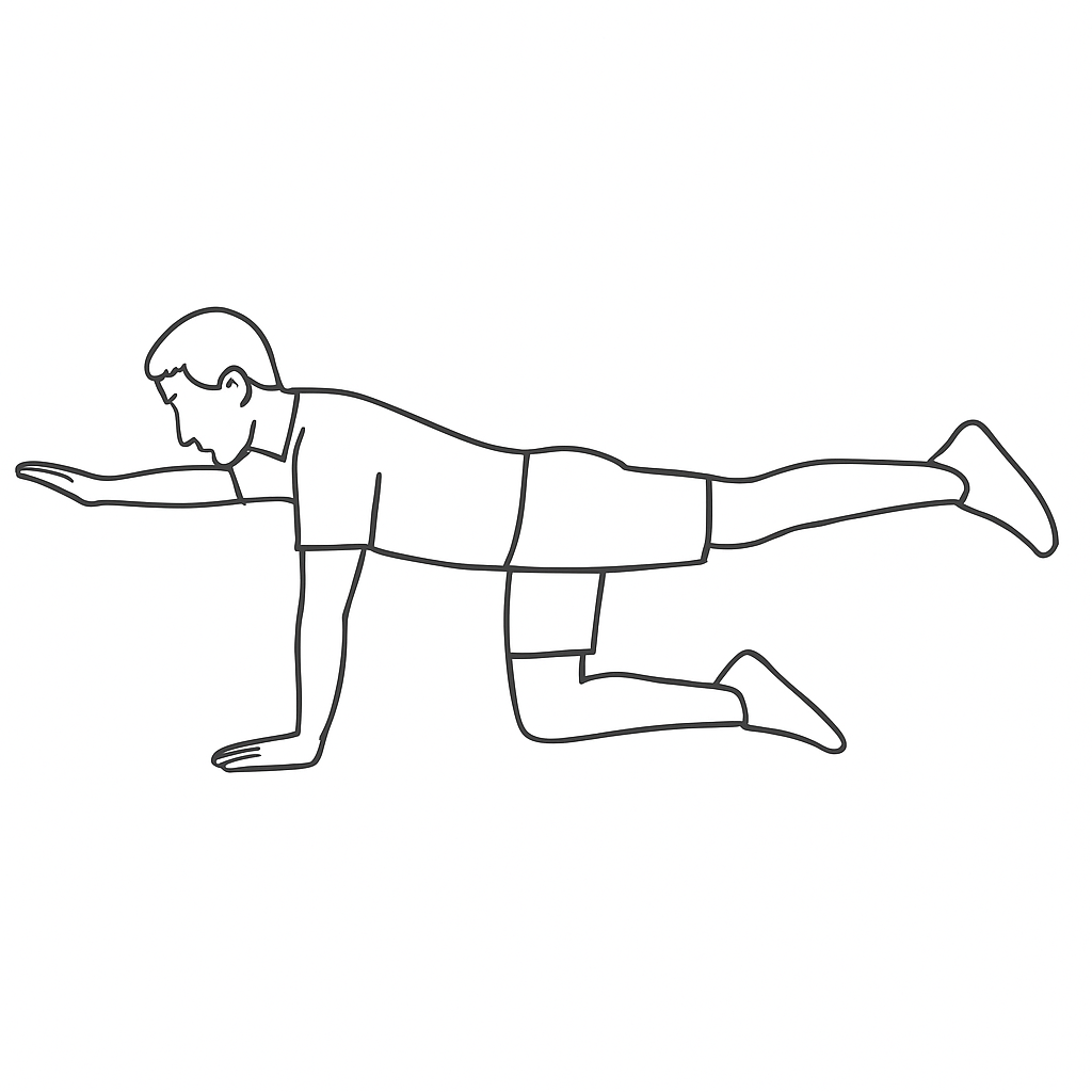 - En cuadrupedia, extiende brazo derecho hacia adelante y pierna izquierda hacia atrás, mantén 5 s, cambia de lado