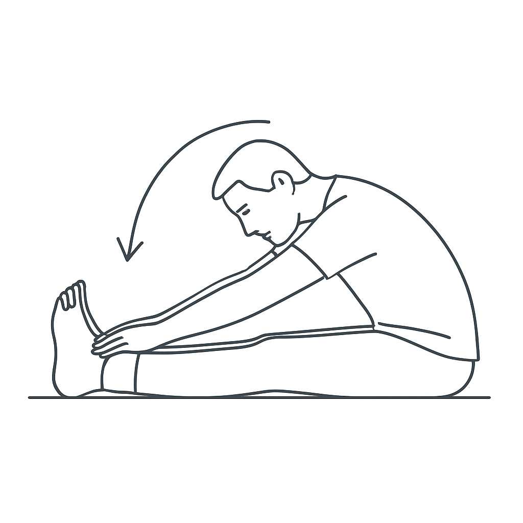 - Sentado con piernas extendidas, inclina el tronco hacia adelante manteniendo rodillas rectas hasta notar estiramiento detrás de los muslos